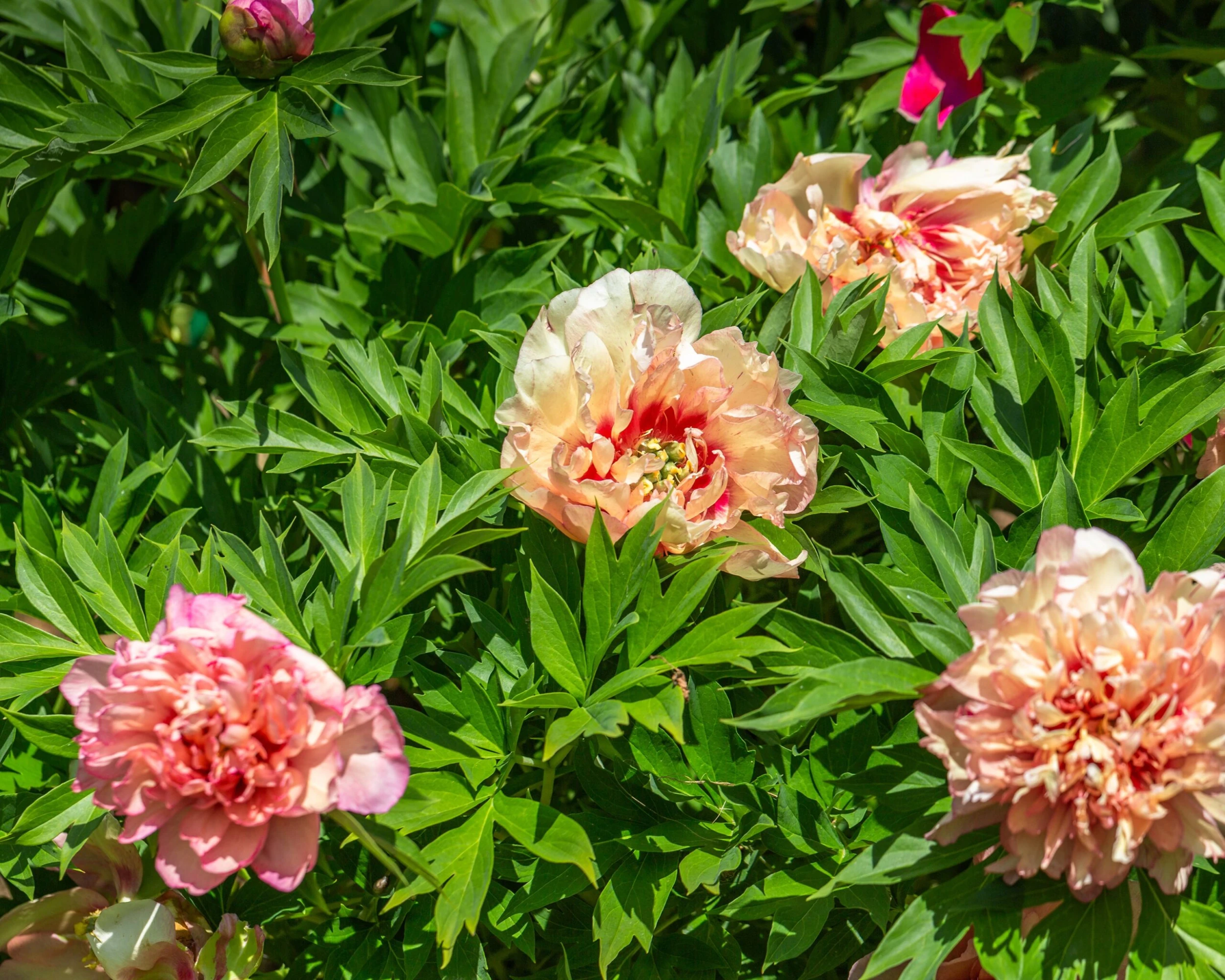 A cross between an herbaceous and a tree peony, Paeonia ‘Hillary’ has stunning, large semi-double rosette flowers in gorgeous shades of raspberry pink, turning to cream as they mature. The blooms, which appear in late spring and early summer, are lightly fragrant. When the finely divided leaves open in spring they have reddish tinges, then they become bright green, before turning red in the autumn. The branches of this Peony are sturdy, so no staking is necessary!