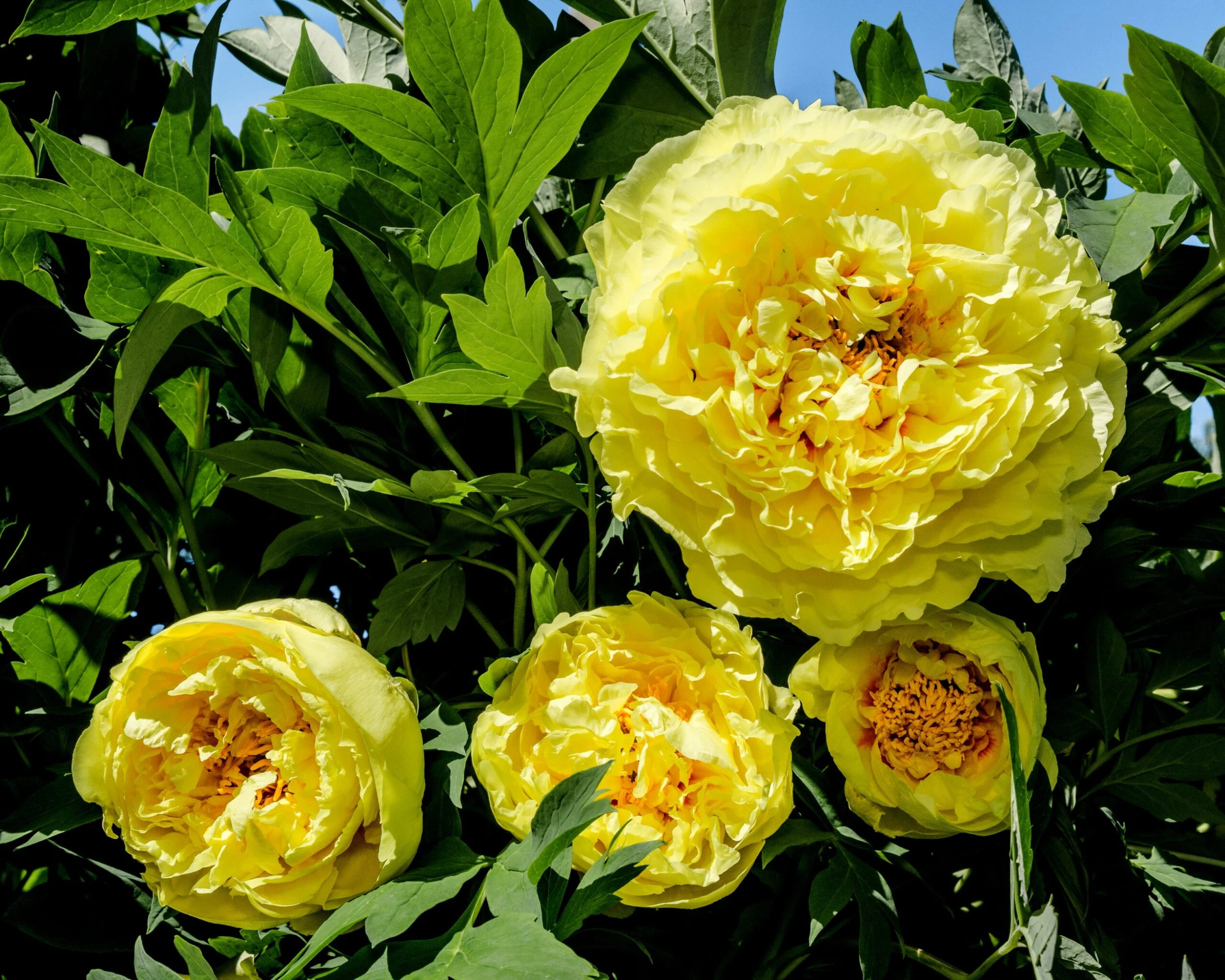 This large golden flower can reach 10 inch or 25cm in size, and every millimetre of that will be pure soft beauty in your garden. Peony ‘Yellow Crown’ is one of the early hybrids that resulted when a white herbaceous peony and a hybrid yellow tree peony were first crossed back in 1948, resulting in intersectional peonies like ‘Yellow Crown’. Very durable, Paeonia ‘Yellow Crown’ will put on their show around mid-summer, regardless of the weather. Its semi-double bright yellow flowers have a touch of red at the base of the petals!
