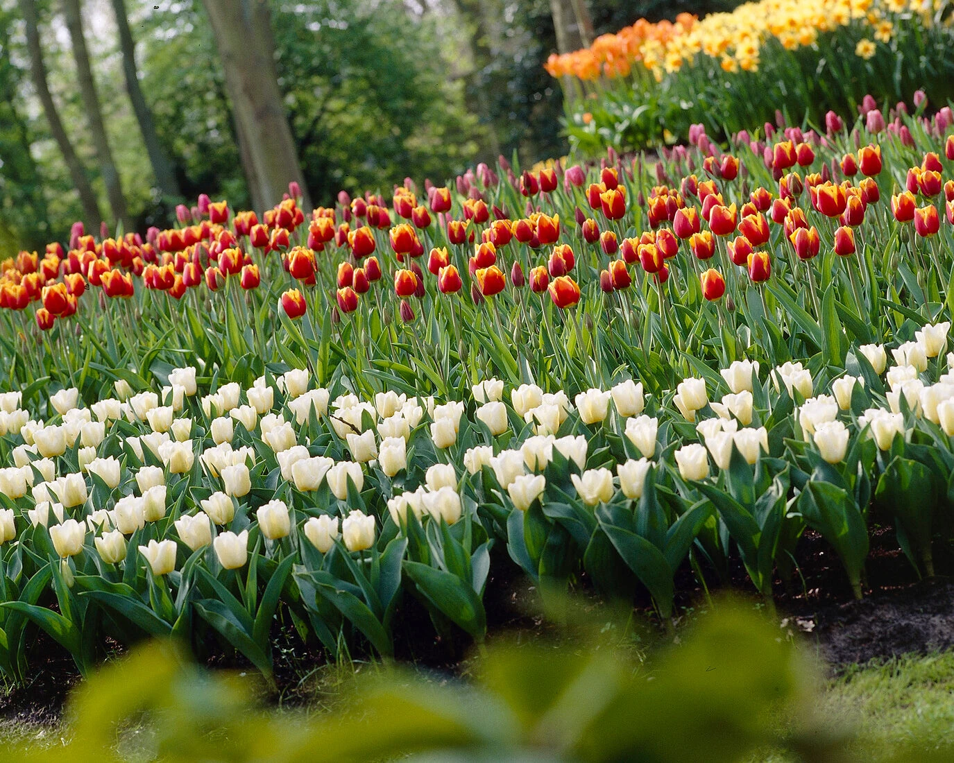 The whiteness of Tulip ‘Calgary’ is enhanced by having cream blushes, slight green veining at the base, and flushed yellow stamens in the centre. It has been around for a few years, and has gained a high reputation for being tolerant of a wide range of garden conditions.