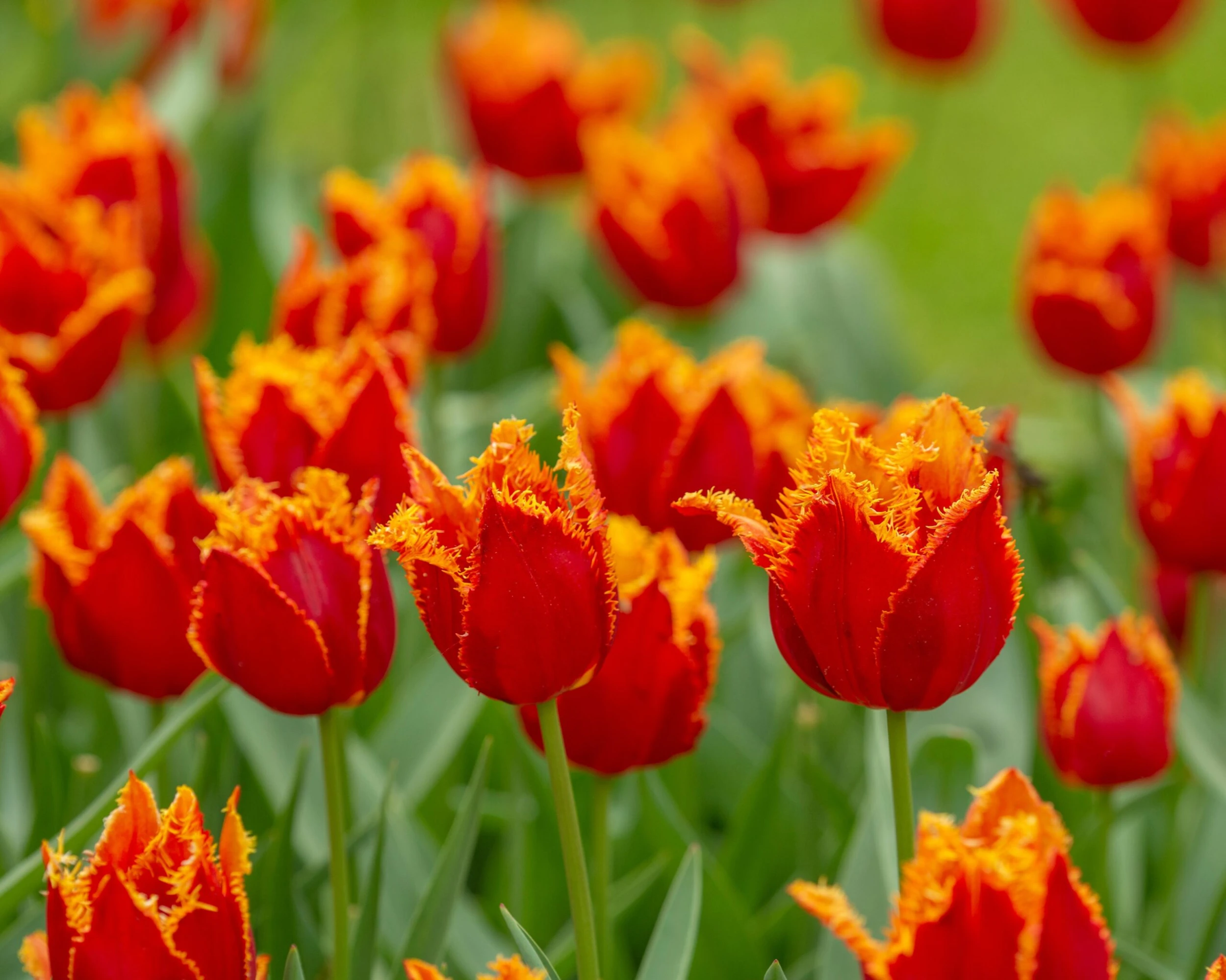 Fringed Tulip ‘Fabio’ is a gorgeous mid-season tulip variety, and it has certainly caught the eye of enthusiasts. It has performed wonderfully well in trials and now gardeners are starting to buy it in their thousands. The dark, orange-red petals of Tulip ‘Fabio’ have all the frills—they are tipped with yellow, fringed edges, making for an unusual combination in both colour and form. These flowers, which appear over several weeks in spring, really stand out from the classic mid-green leaves. Their unique shape creates beautiful texture in the garden. It is one the strongest crispa—or fringed—tulips available.