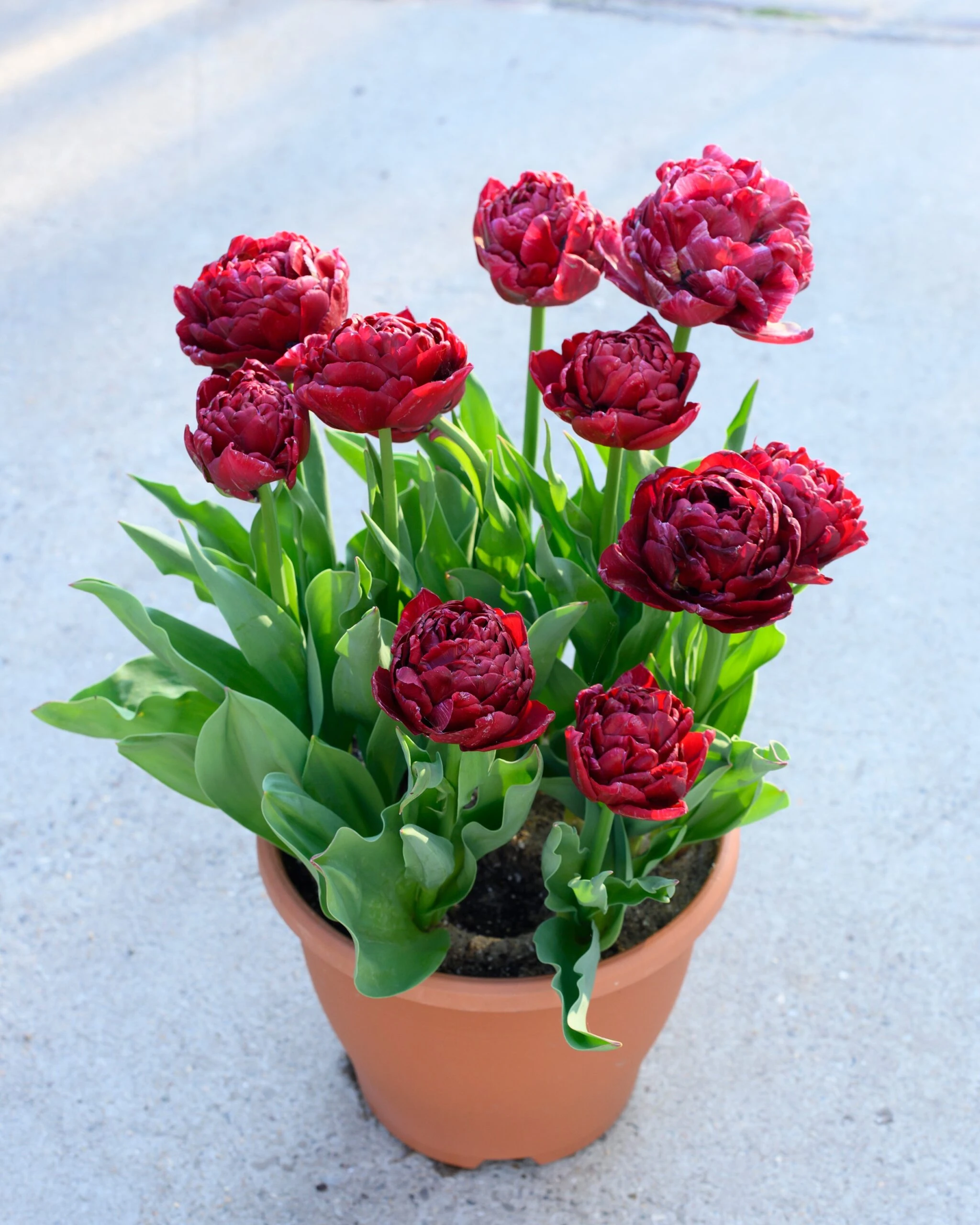 Opening from tightly-packed buds, they emerge slowly, providing a long season of interest as they do. The blooms are rounded like pompons, heralded by the stately stems which reach up to 60cm tall. These versatile beauties sit well in any kind of planting scheme, with their upright structure and dark colour adding contrast to mixed borders, containers or shrubberies. Plant Tulip ‘Nachtwacht’ in large swathes running through the border among other flowering plants for a classic cottage-style look, or dot them through shrubberies or among architectural plants to provide that important streak of early-season excitement in contemporary gardens.